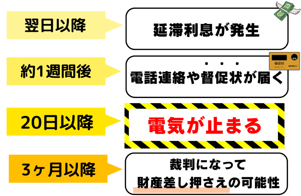 電気の使用料金は、支払い遅れると利用停止になってしまうのですが、それ以上に重いペナルティもあり、たった1日でも取り返しがつかない事態に陥る可能性があります。
